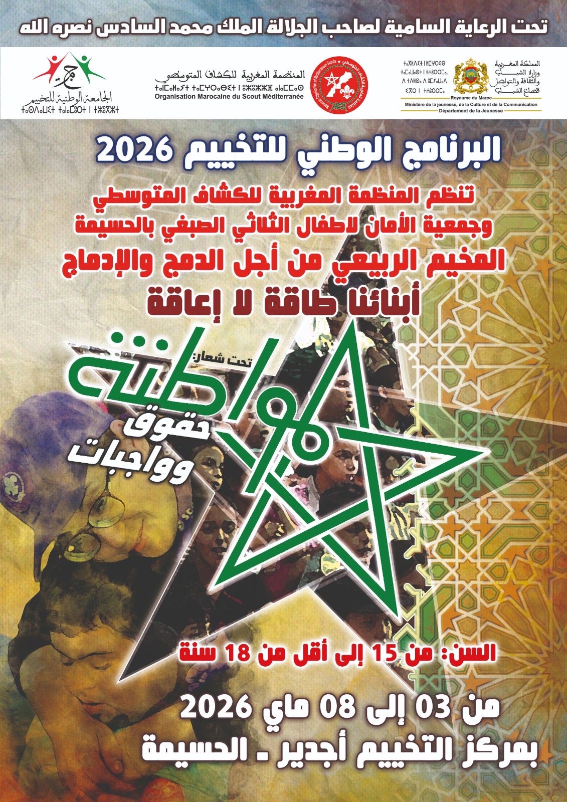 يحتضن مركز أجدير بإقليم الحسيمة، من 03 إلى 08 ماي 2026، فعاليات المخيم الربيعي للدمج والإدماج، المنظم تحت الرعاية السامية لصاحب الجلالة الملك محمد السادس نصره الله. ويستهدف المخيم فئة اليافعين من أطفال الثلاثي الصبغي المتراوحة أعمارهم ما بين 15 وأقل من 18 سنة. ويأتي هذا الموعد التربوي والاجتماعي ليكرس الالتزام المؤسساتي والمجتمعي بقضايا الطفولة في وضعية إعاقة.