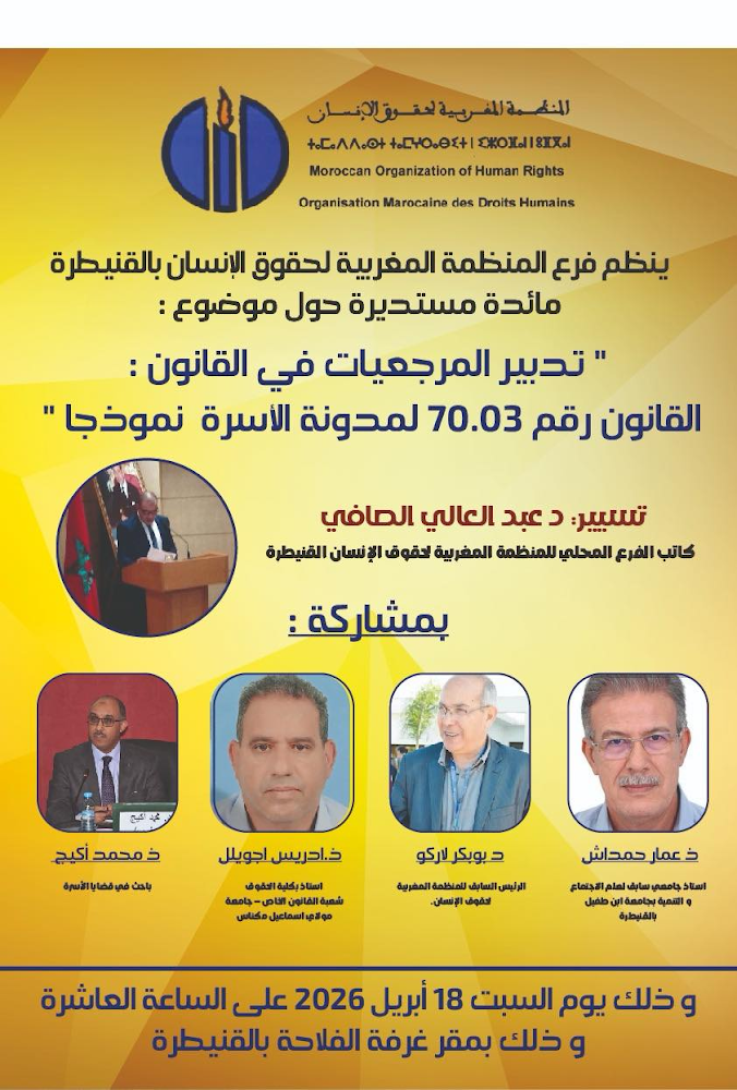 ينظم فرع المنظمة المغربية لحقوق الإنسان بالقنيطرة مائدة مستديرة حول موضوع: «تحيين المرجعيات في القانون: القانون رقم 70.03 لمدونة الأسرة نموذجا»، وذلك يوم السبت 18 أبريل 2026 على الساعة العاشرة صباحا، بمقر غرفة الفلاحة بالقنيطرة.
