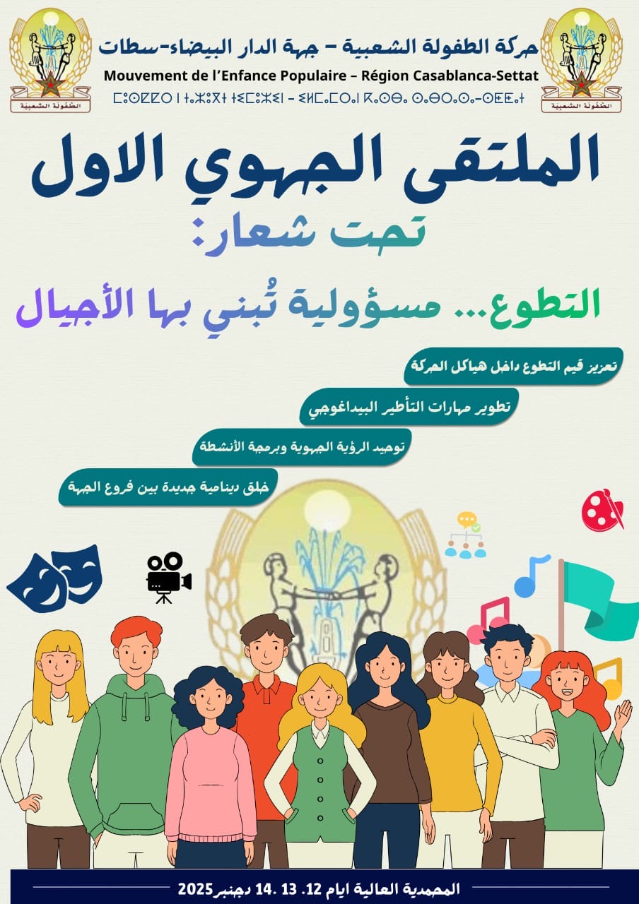 نظمت حركة الطفولة الشعبية الملتقى الجهوي التكويني الأول لأطر جهة الدار البيضاء سطات تحت شعار “التطوع :مسؤولية تبنى بها الأجيال.” أيام 12/13/14 دجنبر2025 بفضاء مخيم العاليا المحمدية ، و عرف البرنامج العام للملتقى الجمع بين ماهو نطري مرتبط أساسا بتعريف الأطر الشابة على تاريخ الحركة الممتدد لسبعين سنة من الاشتغال مع الطفولة والشباب ومرجعتيها الفكرية و أهدافها التربوية وإستراتيجياتها البيداغوجية، من خلال فقرة نبش في ذاكرة الحركة التي استضافت رواد الحركة في لقاء تفاعلي مع الشباب.