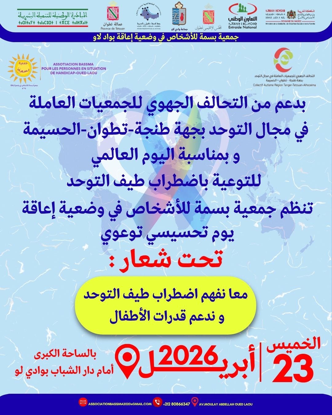 في إطار جهودها الرامية إلى تعزيز الوعي المجتمعي بقضايا الإعاقة، نظمت جمعية بسمة للأشخاص في وضعية إعاقة، بدعم من التحالف الجهوي للجمعيات العاملة في مجال التوحد بجهة طنجة-تطوان-الحسيمة، يوما تحسيسيا توعويا بمناسبة تخليد اليوم العالمي للتوعية باضطراب طيف التوحد، وذلك يوم الخميس 23 أبريل 2026 بالساحة الكبرى أمام دار الشباب بمدينة واد لو.